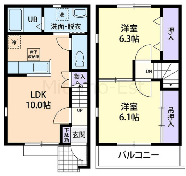 | 間取詳細 | (1階)LDK10.0帖 (2階)洋室6.1帖・6.3帖 | ||